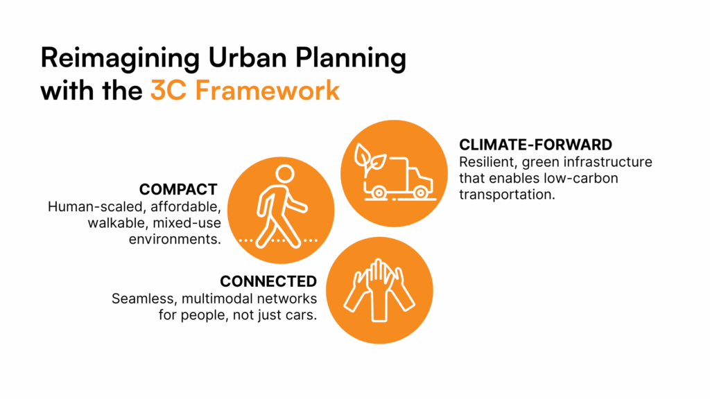 Where traditional planning frameworks often separate land use, mobility, and environmental goals into distinct silos, the 3C Framework emphasizes that these elements must work together as an integrated system. Compact growth isn’t enough if neighborhoods aren’t connected. Connectivity isn’t meaningful if the infrastructure can’t withstand climate shocks. And resilience falls flat if residents don’t have safe, local access to the essentials of daily life. By weaving all three principles together, the 3C Framework helps ensure that planning outcomes are coherent, inclusive, and future-ready.