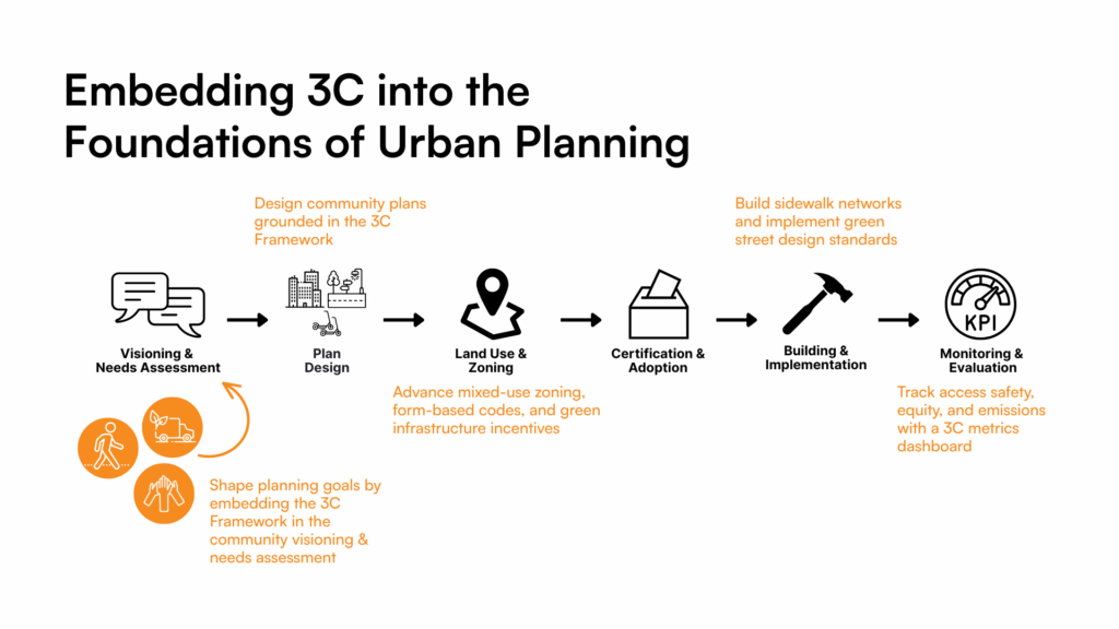 When applied consistently, 3C transforms how projects are scoped, designed, and funded. Visioning sessions shift to focus on neighborhood access, not just land use. Zoning codes prioritize active ground floors and infill, not parking minimums. Infrastructure investments focus on continuous networks, not isolated fixes. Engagement efforts surface lived experiences—where the sidewalk ends, where shade is lacking, and where access is inequitable—and directly link those to climate resilience strategies. Over time, 3C becomes institutionalized, guiding budgets, policies, and design standards.