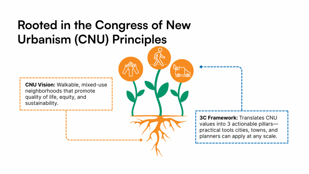 Before diving into the details, it helps to pause and ask: What does it actually mean to design for walkability today? The 3C Framework answers that question with three simple but powerful principles.